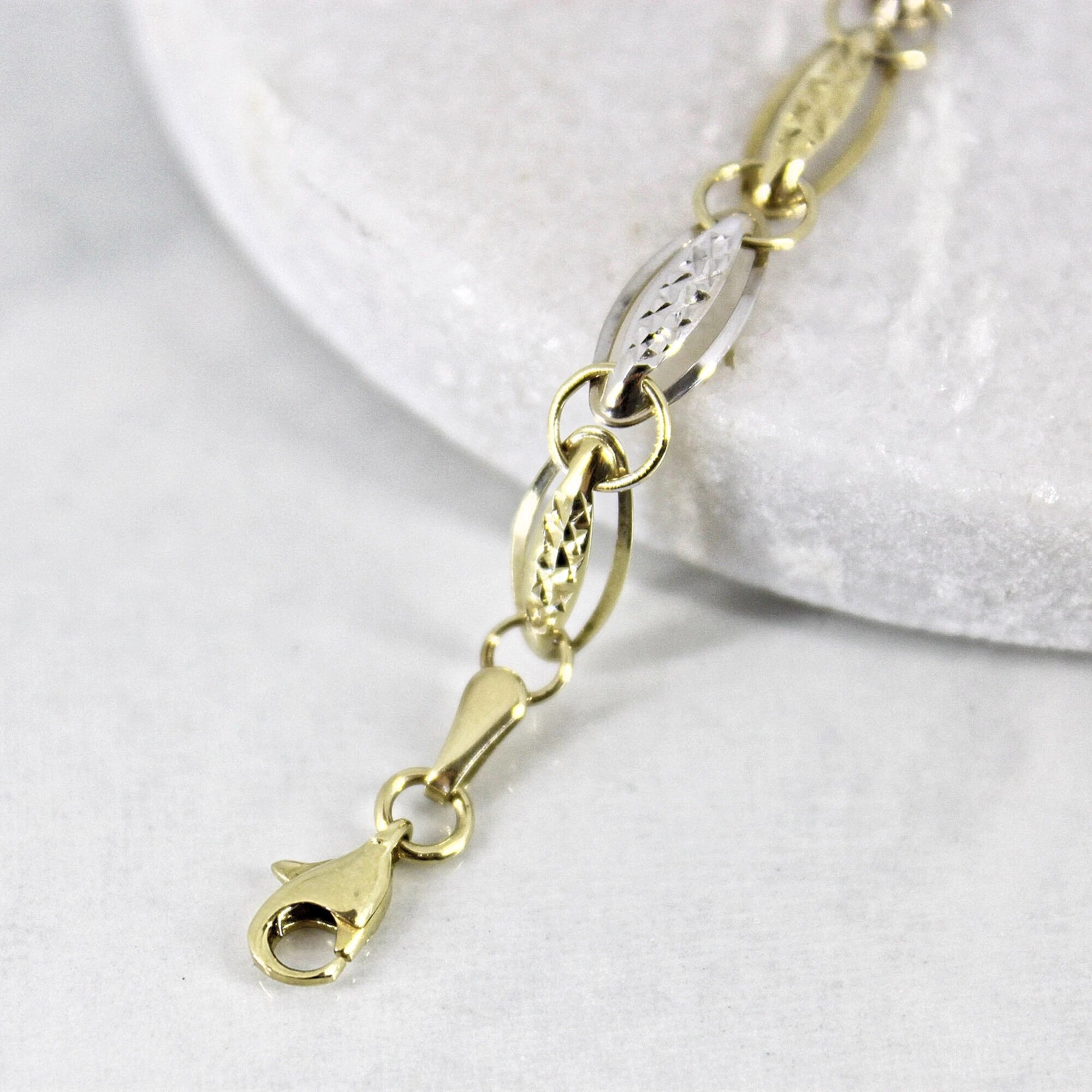 this necklace features alternating oval white and yellow, diamond-cut links connected by yellow gold cricles, all in 10k gold. this stunning piece is perfect to be worn on its own or layered with other chains or necklaces.